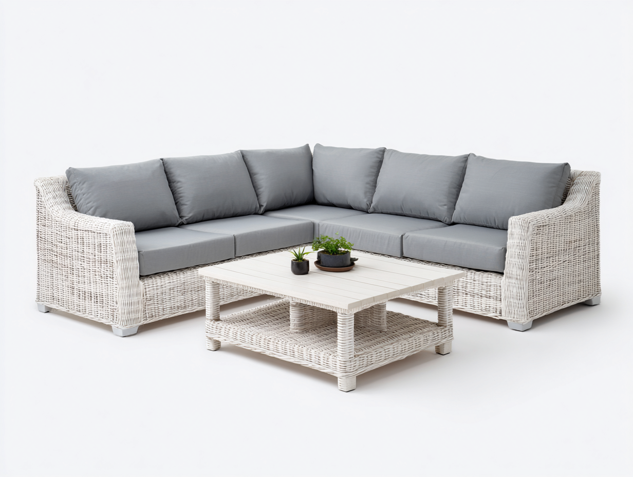 La configurazione angolare aiuta a sfruttare bene lo spazio e rende il set adatto a diverse soluzioni di arredo outdoor. I braccioli ampi aumentano il comfort d'uso, il tavolino coordinato offre un piano d'appoggio comodo e la linea essenziale facilita l'inserimento in ambienti moderni, luminosi e naturali.
