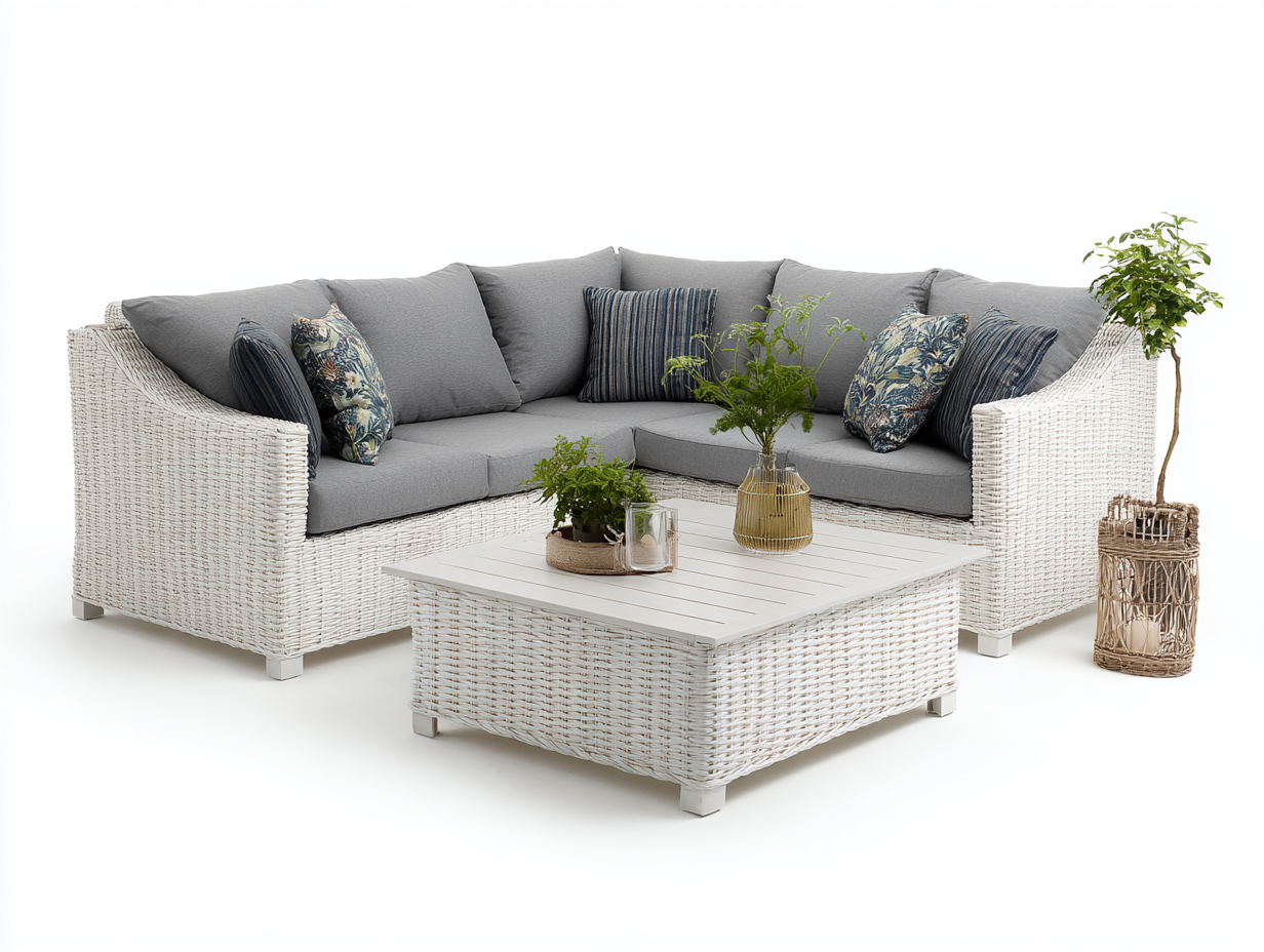 Set da esterno progettato per arredare in modo funzionale giardini, terrazze e patii. La configurazione con divano angolare e tavolino crea uno spazio pratico per momenti di relax e convivialità all'aperto, mantenendo un aspetto ordinato e armonioso.