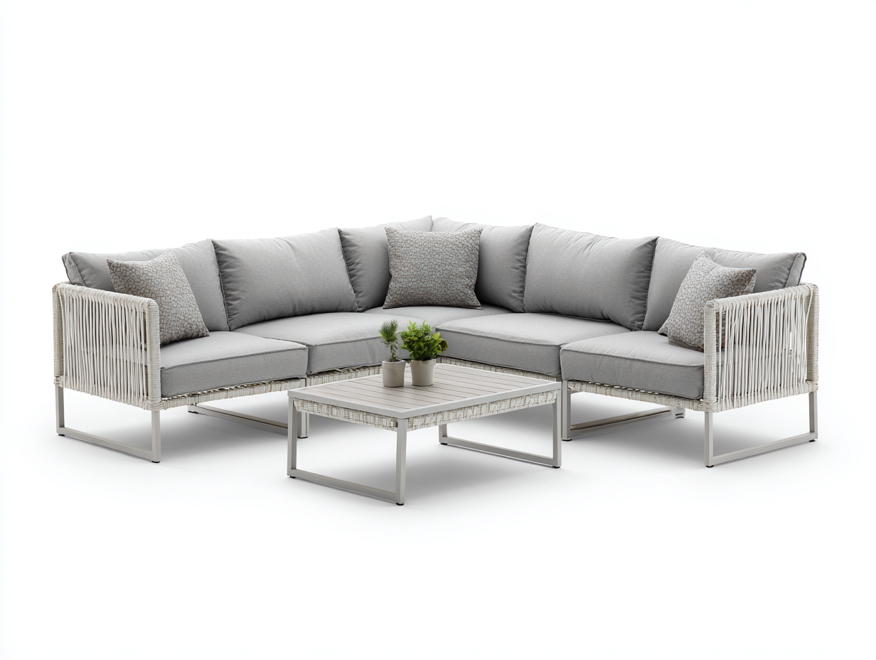 Il design angolare permette una gestione efficiente dello spazio e garantisce una seduta ampia e stabile. Il tavolino coordinato offre una superficie pratica per oggetti di uso quotidiano. Lo stile lineare facilita l'integrazione in diversi ambienti outdoor.