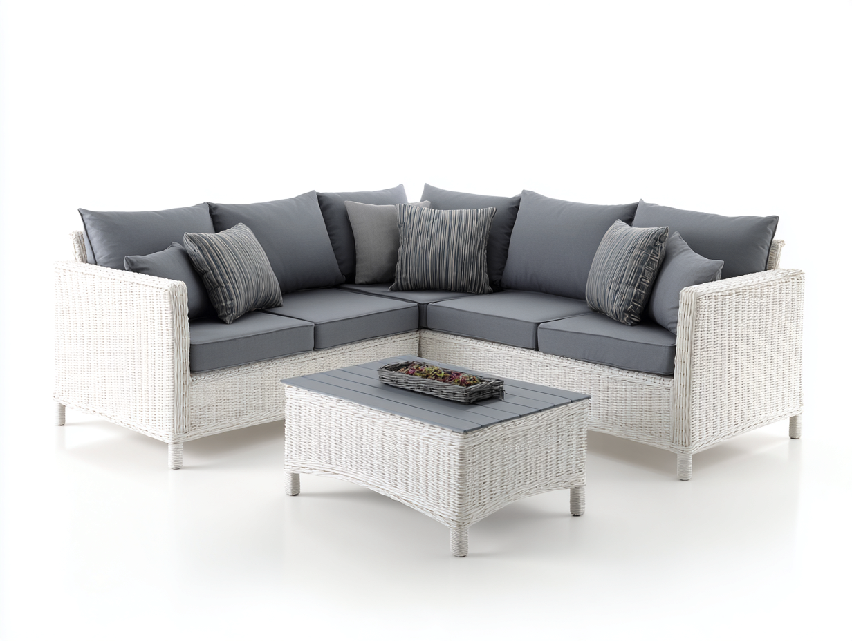 Set da esterno progettato per creare un'area relax funzionale in giardino, terrazza o patio. La configurazione con divano angolare e tavolino coordinato consente di organizzare uno spazio accogliente per momenti di riposo e socialità all'aperto.