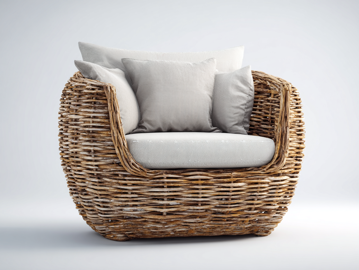 Realizzata in rattan intrecciato con seduta rivestita in tessuto di colore grigio chiaro. La lavorazione dell'intreccio evidenzia una finitura naturale e uniforme, offrendo resistenza e stabilità, mentre il rivestimento tessile garantisce una piacevole sensazione al contatto.
