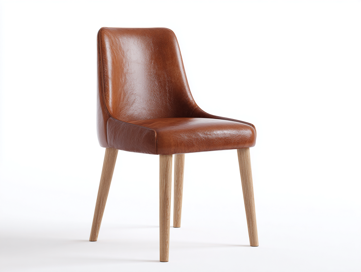 La seduta è rivestita in pelle sintetica marrone con finitura leggermente lucida, progettata per essere resistente e facile da pulire. Le gambe sono realizzate in legno con finitura naturale, offrendo stabilità e un aspetto caldo e accogliente.